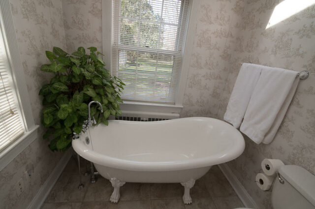 The private in room bath now with 1938 barn door with a clawfoot tub and large shower with body jets.
